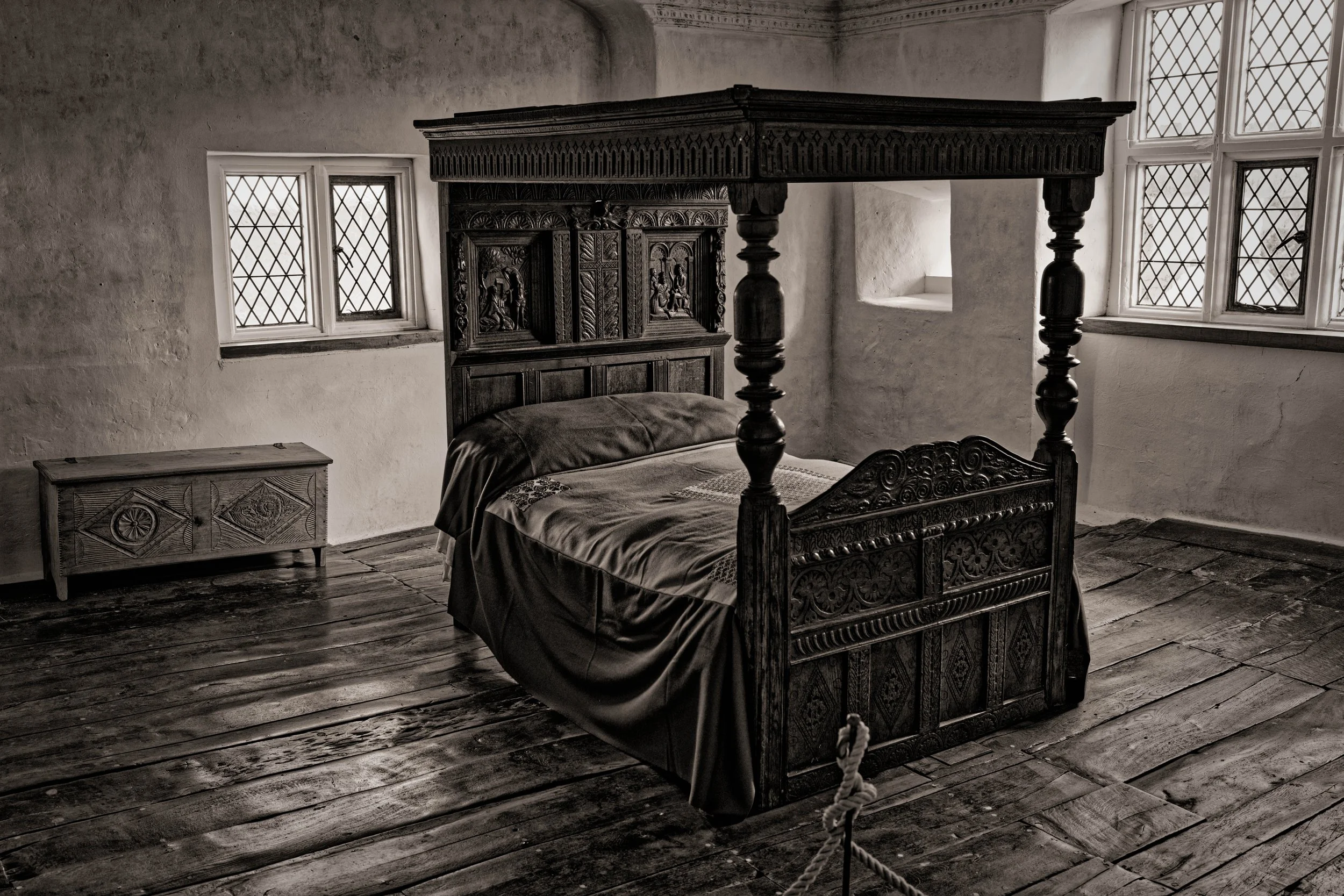 Ein Bett, das in einem Bürgerhaus steht.