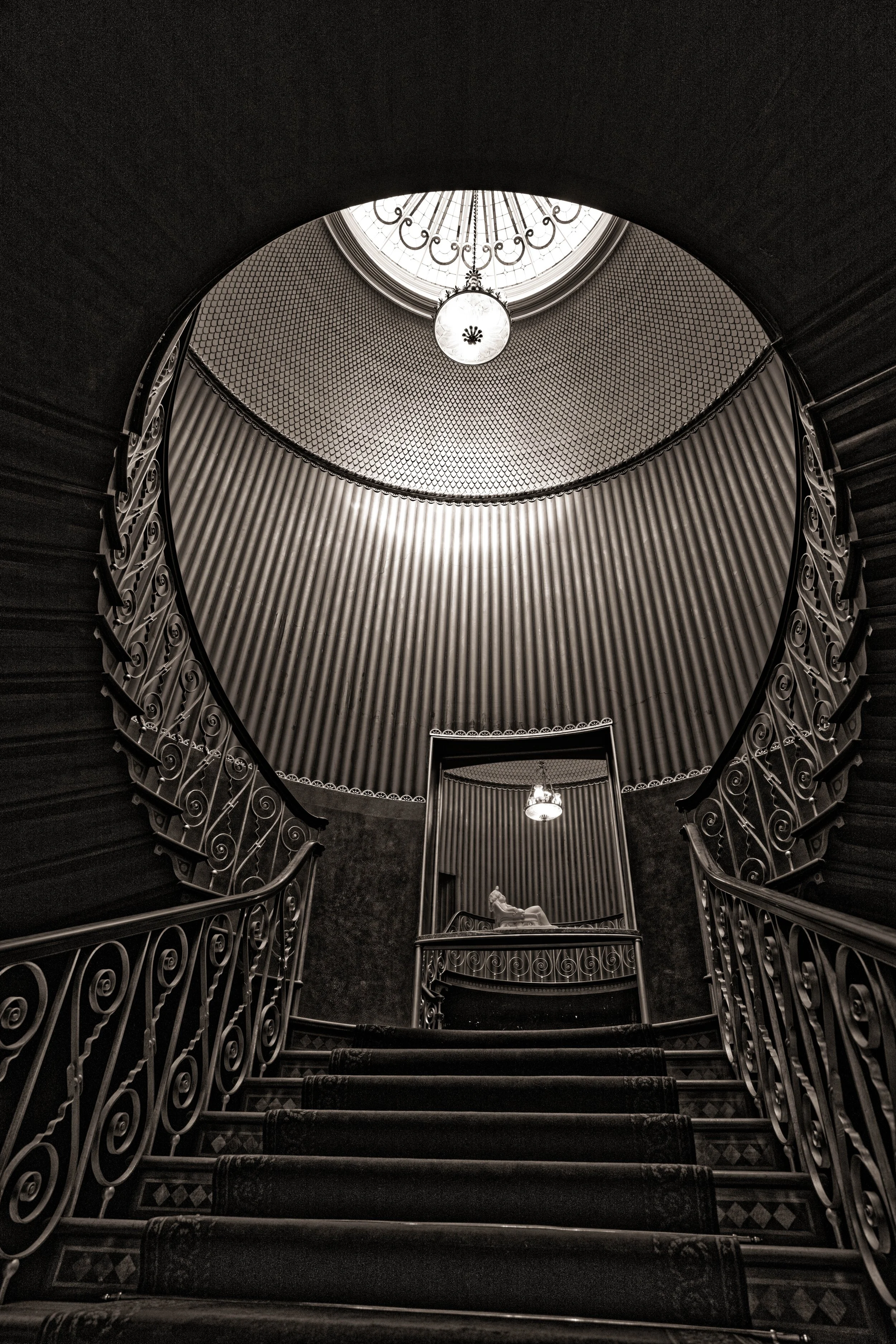Ein runder Stiegenaufgang, der sich von unten nach oben schlängelt.