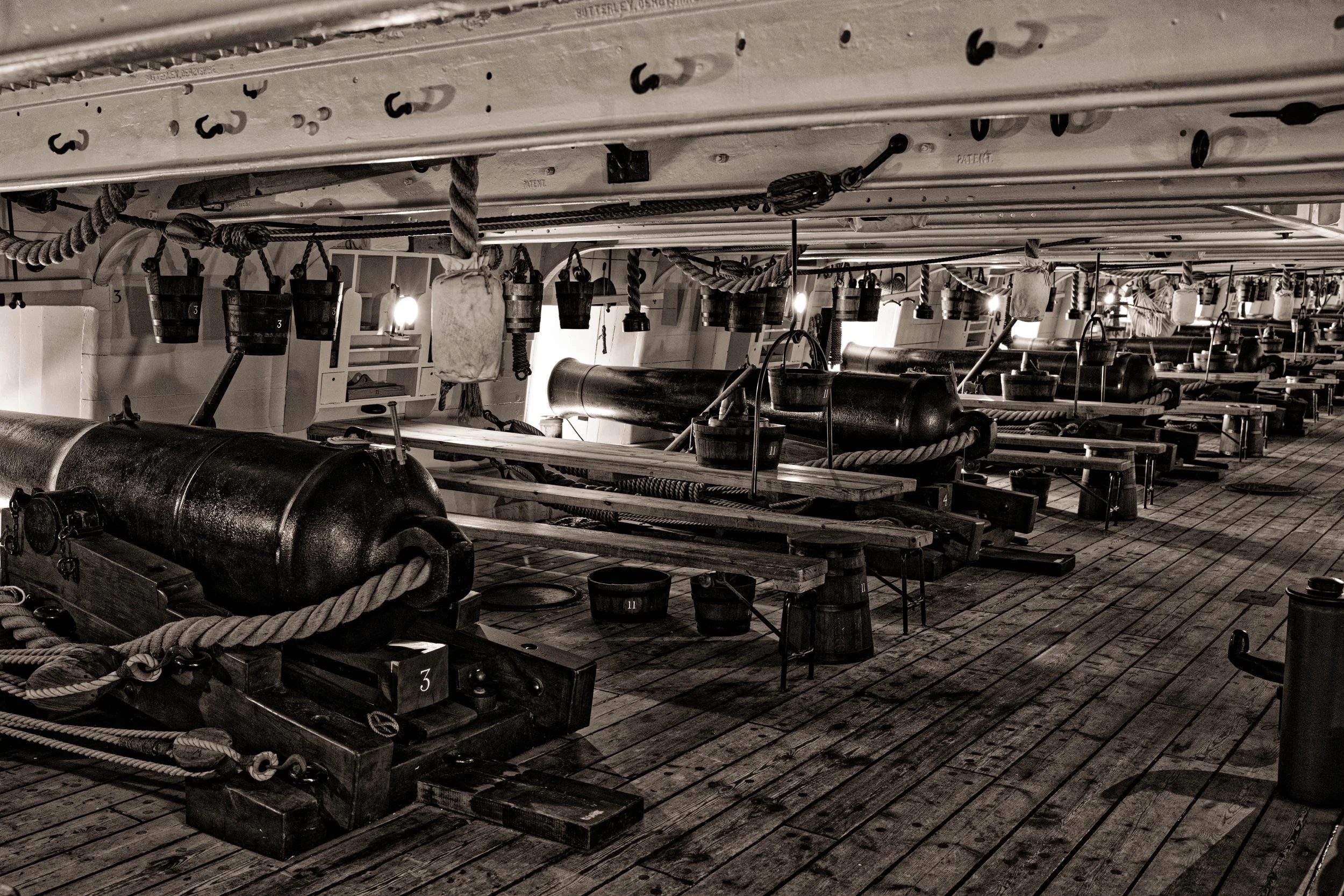 Auf dem historischen Kriegsschiff war es üblich, in einer Hängematte, die sich neben den Kanonen oberhalb des Tischs befand, zu schlafen.