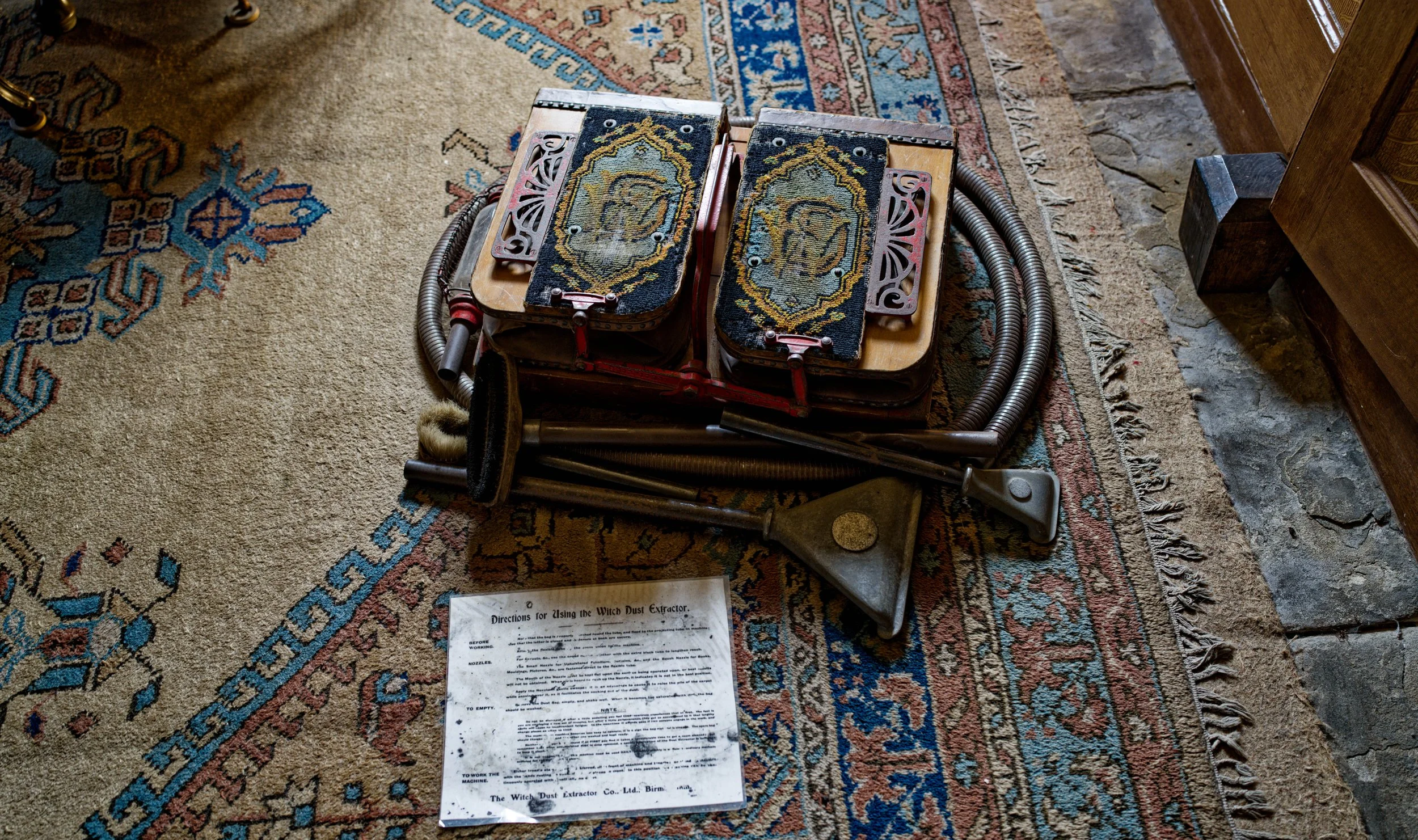 Es handelt sich um ein Gerät, das mittels Muskelkraft betrieben wird und zum Saugen von Staub konzipiert ist.